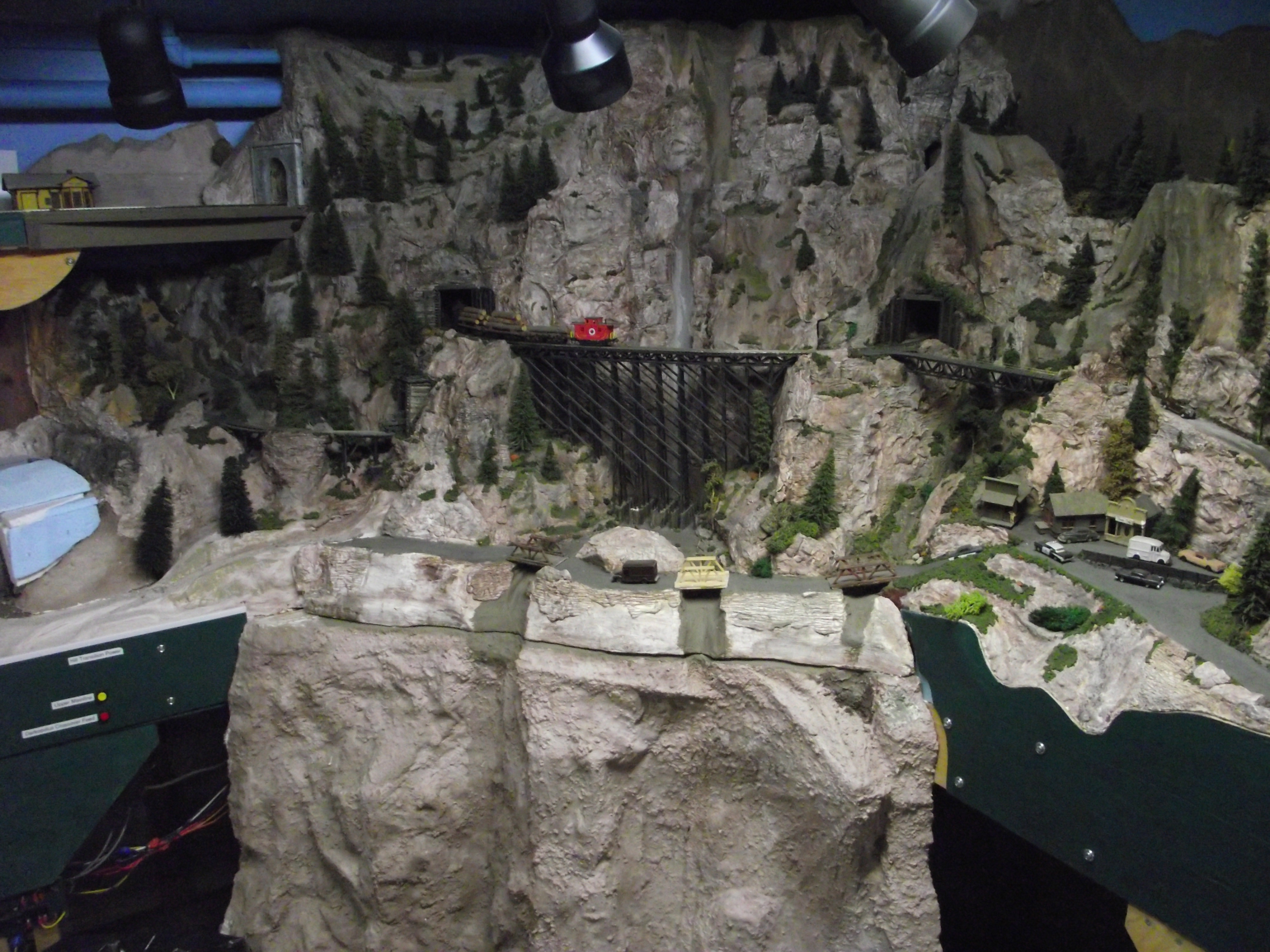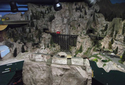 Our current ambitious 25 x 50 foot HO Scale layout was begun after moving to our current home in 2000. For those new to model railroading, HO scale is the most popular train scale with models 1/87th of actual size. In otherwords if you have a building that is 87 feet long, an HO scale model of it would be 1 foot long. The track plan is a combination of around the walls oval, with a second oval on a central penisula. A simple 14" deep shelf adds an additional around the walls oval for extra operating potential. Access to the layout room is via stairs from above. The layout itself is walk around with generous aisle widths, save for the central operating pit within the penisula. Access to the central area, as well as the crew room, work benches, and washroom are made easy by removable bridge sections that are only put in place during operations. After a decade of planning and work construction is well advanced, with all of the benchwork built, 95% of the track laid and wired, and a good portion of scenery in various stages of completion.